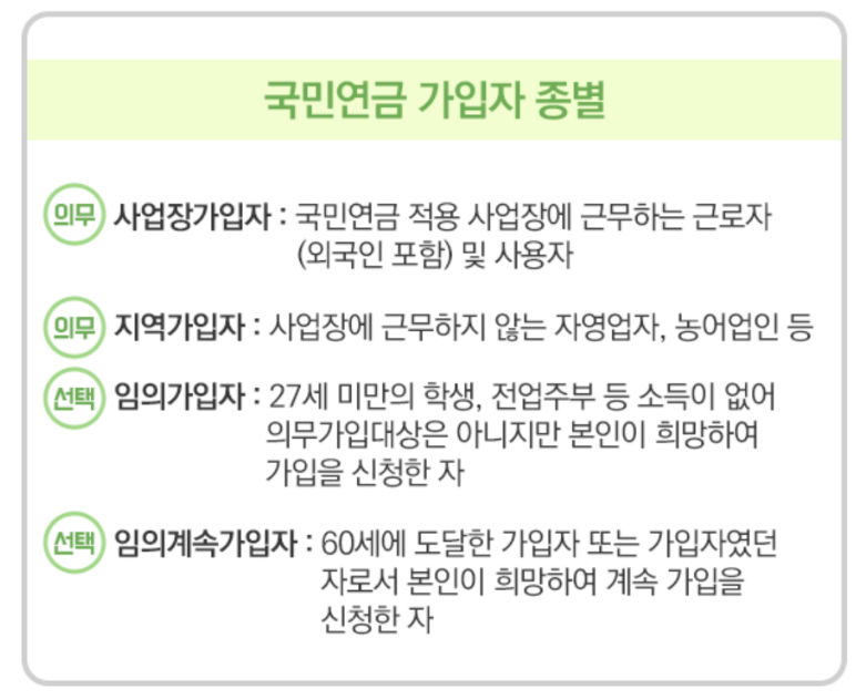 만 18세에서 60세 미만인 대한민국 국민 중 특별한 경우를 제외하고는 국민연금 가입이 의무화되어 있습니다. 다만 가입자의 종류에는 차이가 있으며 사업장, 지역, 임의, 임의 계속 가입자로 나뉩니다. 아래 표 사진을 참고해주시길 바랍니다.