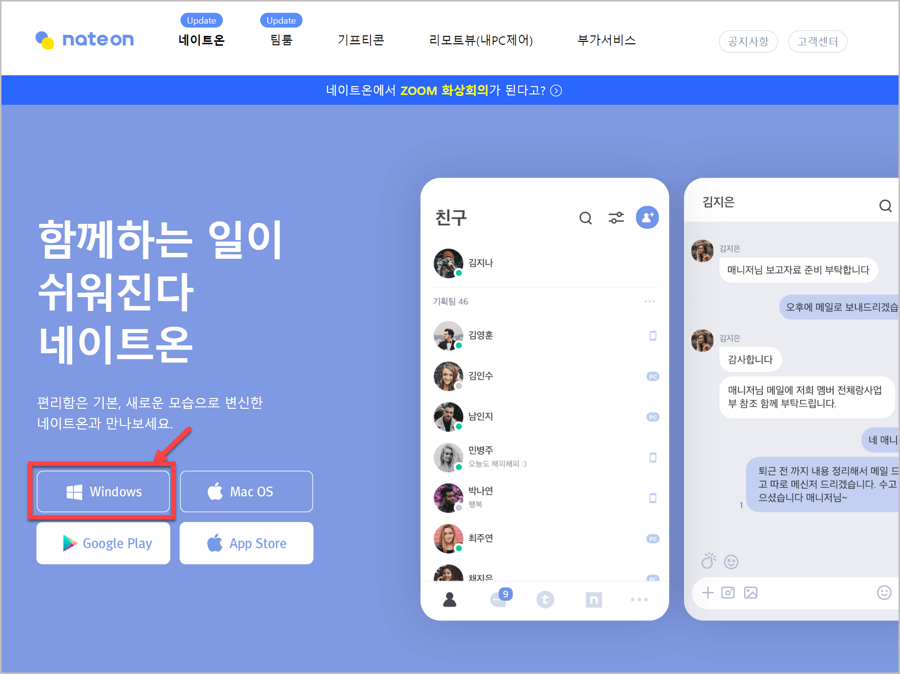 네이트온 다운로드를 하는 가장 좋은 방법은 공식 홈페이지에서 이용을 하는것입니다. 위 링크로 들어가시면 쉽게 다운로드를 할 수 있습니다. 과거에는 윈도우즈에서만 이용할수 있었지만, 요즘에는 맥과 구글플레이 그리고 앱스토어에서도 이용을 할 수 있습니다.