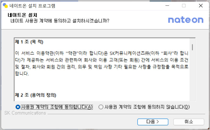 구성요소 선택을 할때 주의해야하는것이 있습니다. '네이트온제공설정'이라는 항목이 있는데 이곳에서 필요 없는것이 설치가 될 수 있습니다. 그렇기 때문에 필요없다면 이를 체크해제하고 설치를 해야합니다. 이 과정 빼고는 딱히 주의할것이 없습니다.