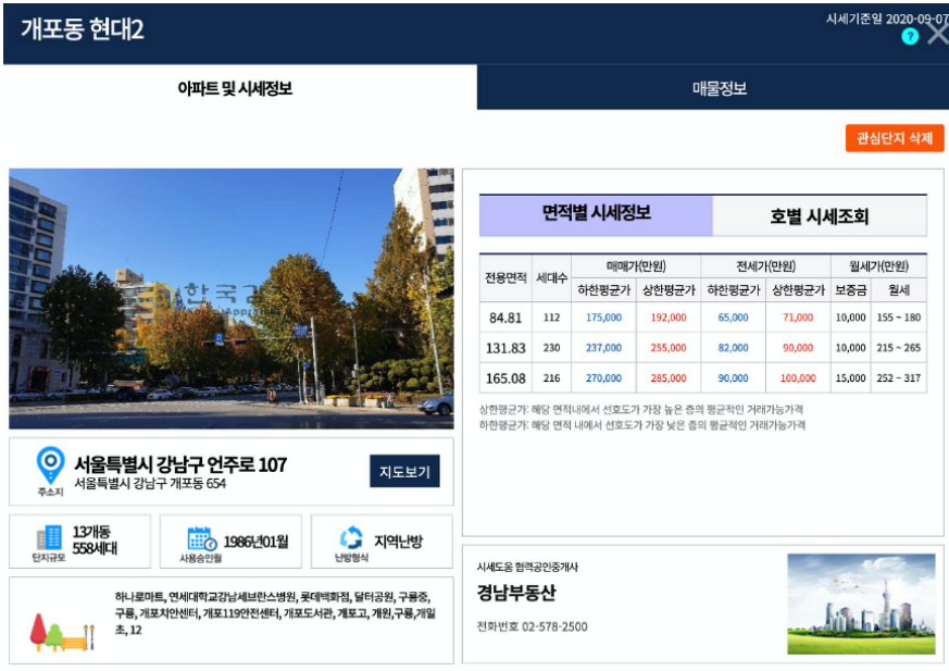 그리고 위에는 개포동 현대2 아파트를 예시로 가져온 것인데 이렇게 아파트를 선택하면 면적별 조회가 가능합니다. 하나 팁을 드리자면 조건검색을 활용하면 더 빠르게 정보를 찾을 수 있습니다.