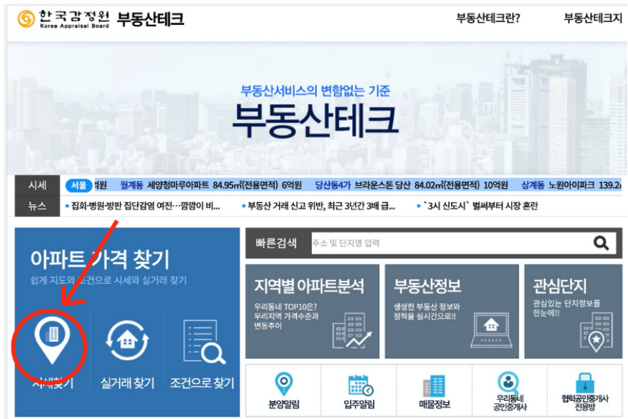위 링크를 통해 접속하면 다음과 같은 화면을 볼 수 있습니다. 여기서 아파트 가격 찾기-시세찾기를 클릭하면 확인할 수 있습니다.