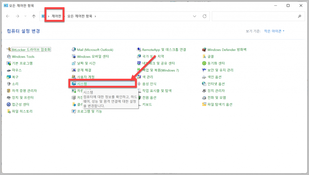 첫번째 방법은 제어판을 열어 "시스템"을 클릭하는 것 입니다. 위 화면과 같이 모든 제어판 항목을 열면, 현재 사용 중인 컴퓨터의 설정 정보를 한눈에 볼 수 있습니다. 이곳에서 '시스템'을 클릭하면 PC에 대한 정보를 확인하고, 하드웨어 성능 및 원격 연결에 대한 설정을 변경할 수 있습니다.