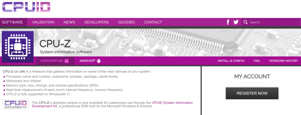 위 링크를 통해 CPUID홈페이지로 이동할 수 있습니다. CPU-Z는 PC의 하드웨어 및 시스템 정보를 출력해주는 유틸리티 소프트웨어로 윈도우 95 이후의 버전이라면 모든 윈도우에서 사용할 수 있습니다. 설치 버전과 포터블 버전 중 선택할 수 있는데, 포터블인 경우에는 별도의 프로그램 설치 없이 사용 가능합니다.