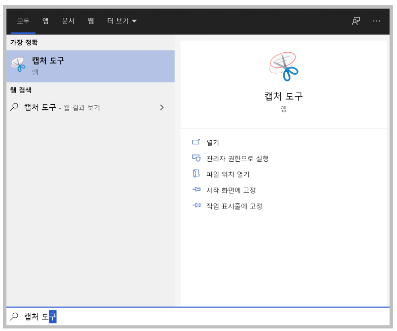 Window 키를 누르고 '캡처 도구' (띄어쓰기 주의)를 검색하면 위와 같은 캡처도구 프로그램이 나오게 됩니다. 이것은 캡처부터 편집까지 한번에 가능하도록 만들어진 프로그램입니다.
