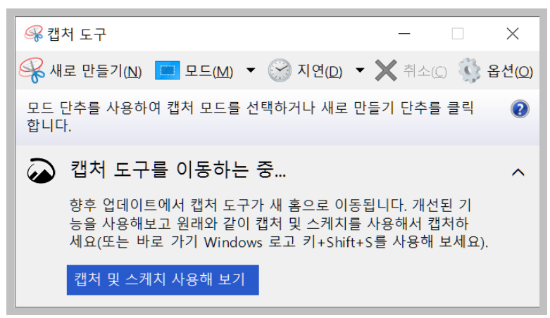 캡처 도구를 실행하면 위 처럼 두번째 방법에 대한 안내를 해주고 있습니다. 아마도 윈도우 업데이트가 계속되면 캡처 도구는 더이상 지원하지 않을 가능성이 많을것 같네요.